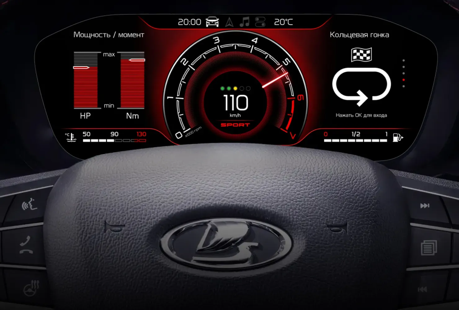 В красно-черной гамме выполнена и новая комбинация приборов. В ее функционал добавлена возможность записать лучшее время круга и лучшее время разгона на 1/4 мили.